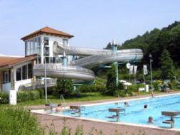 Im angegliederten Freibad gibt es eine große Rutsche, eine Liegewiese mit Beachvolleyballfeldern, einen Kiosk und ein separates Baby-Planschbecken.